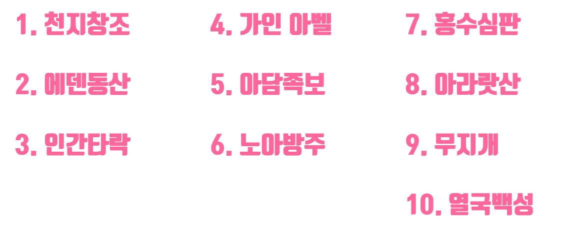 10개씩 나무의 이름을 정리했다. 이렇게 정리하면 좀 더 쉽게 외우고 기억할 수 있다. 창세기는 시간의 순서, 역사적 순서를 따라 사건을 떠올리며 정리하면 좀 더 쉽게 기억할 수 있다.